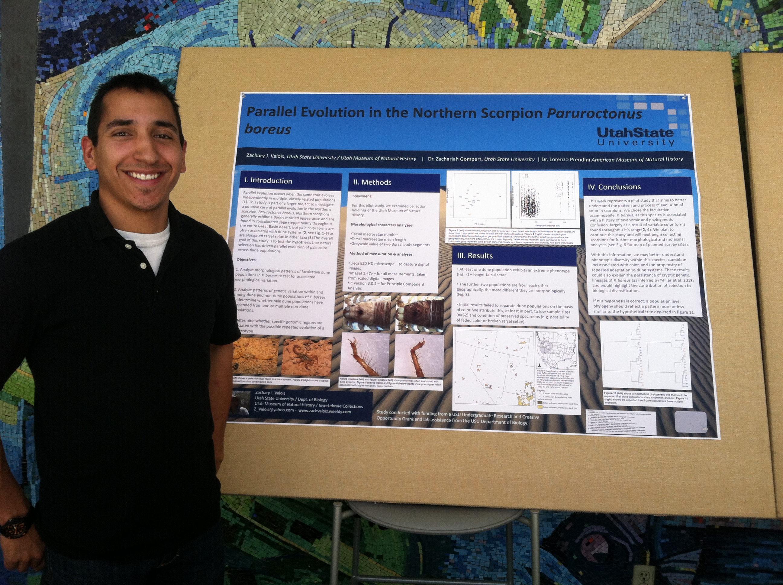 Peter Nelson, Robert Olson, and Zach Valois were awarded summer research fellowships (SURCO’s) to work in the lab. This will provide a great opportunity for them to gain lab and field experience. Zach Valois was also awarded research grants from USU (URCO) and from the American Museum of Natural History (Theodore Roosevelt Memorial Fund). Zach presented preliminary findings form his funded project investigating parallel evolution in the Northern Scorpion at the USU Department of Biology Spring 2014 Undergraduate Research Symposium (pictured below).